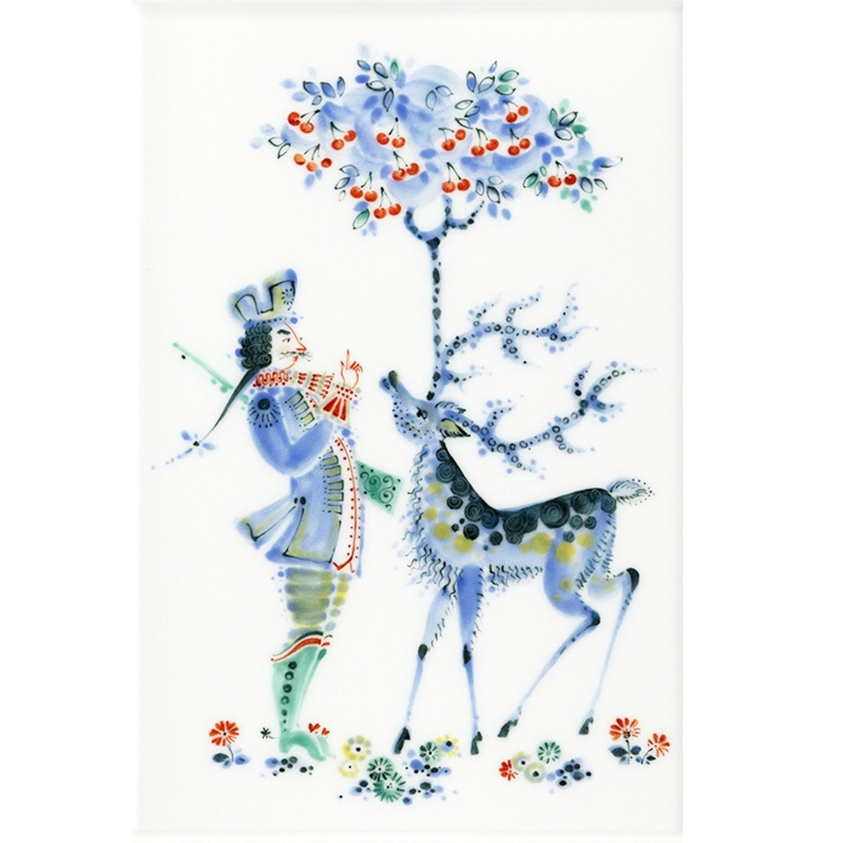 優しさと愛らしさと同時に非現実的な絵柄は、頭からサクランボの木が生えた鹿です。「男爵にサクランボの種を額に打たれた鹿。翌年、男爵の前に現れた鹿の額からはサクランボの木が生え、実がなっていました。男爵はそのサクランボを美味しく食べた」という内容で、とてもユーモラスだと思います。