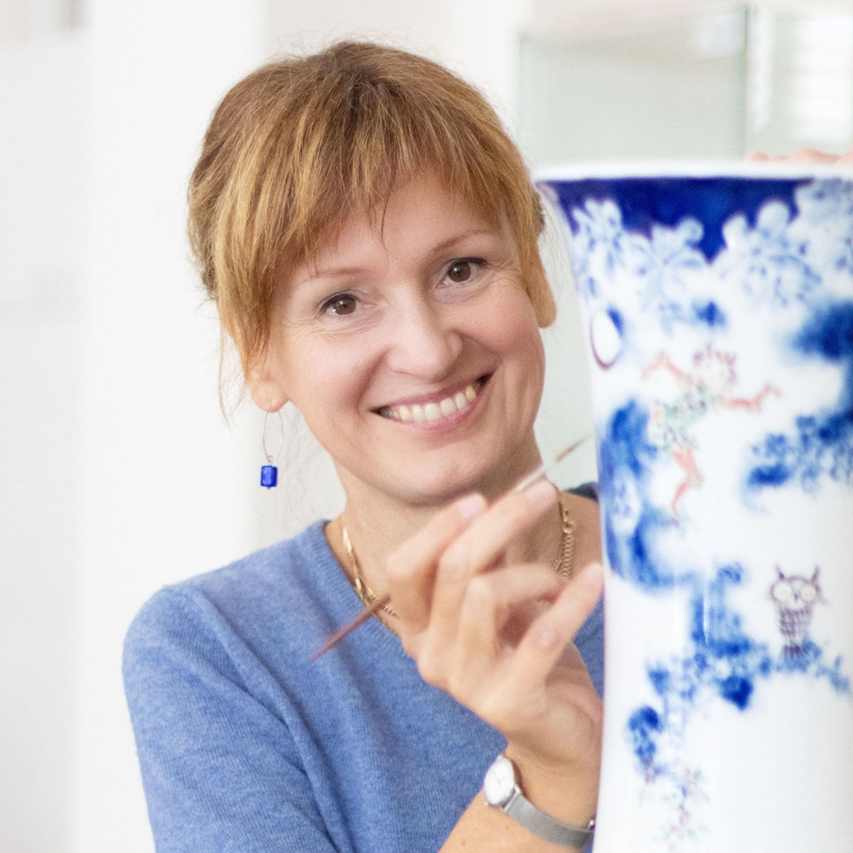 E.D. この絵付は、しっかりとした筆数と柔らかい筆使いとの緊張感あるコントラストがある一方、全体を通して繊細なニュアンスのブルーの色合いを基調としています。またこのブルーは銅を含む顔料で、焼成工程において非常に扱いにくく、すぐに暗すぎたり明るすぎたりしてしまいます。この顔料を扱うのは大変難しくある程度の経験が必要とされています。