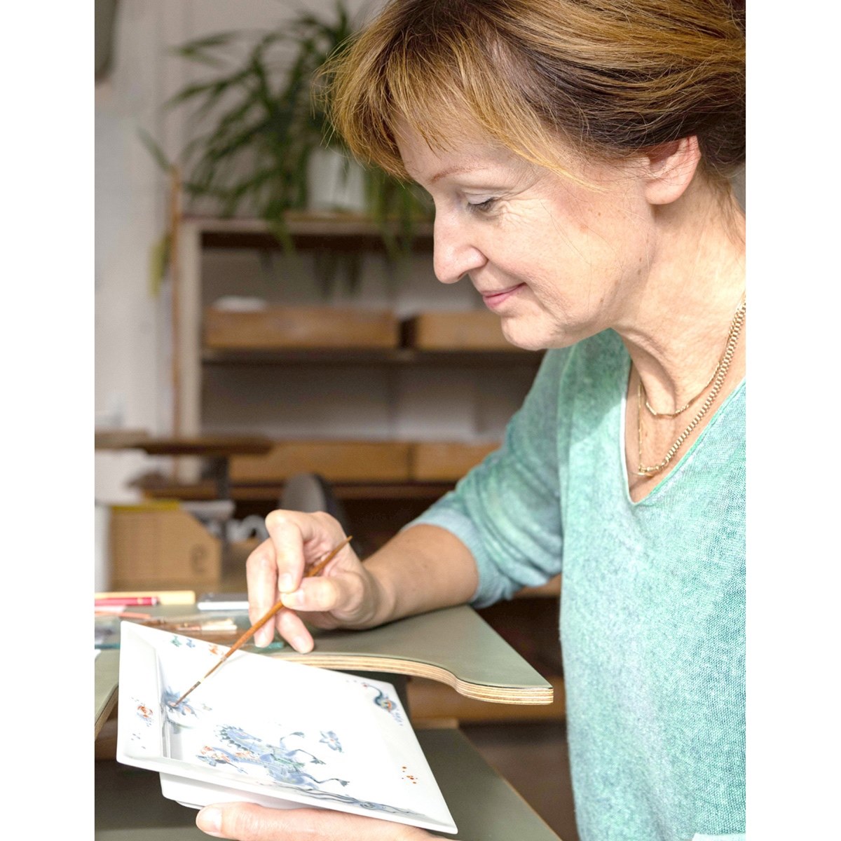 エルケ・ダンネンベルク氏(以下E.D.):オリジナルに忠実に描くことがとても大切なことです。今でも描く時には、必ず手本を前に置き描いています。伝統を受け継ぐとは、絵付師がアレンジを加えることなく、原画のクオリティーを後世に伝え残していくことがまず一番重要なのです。