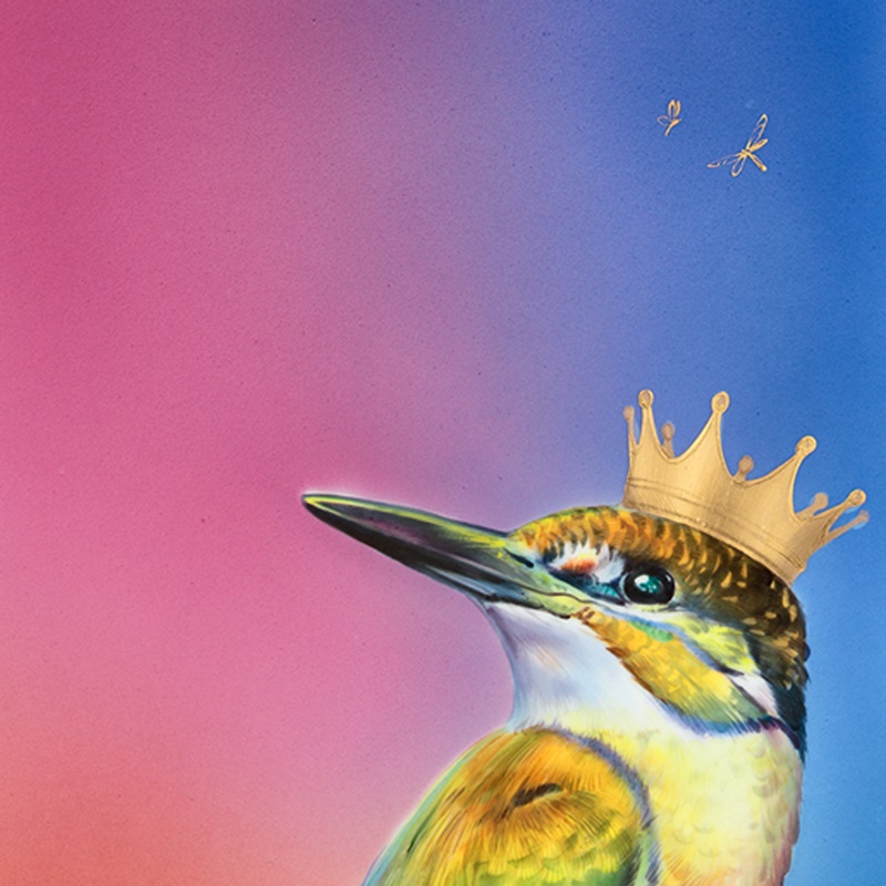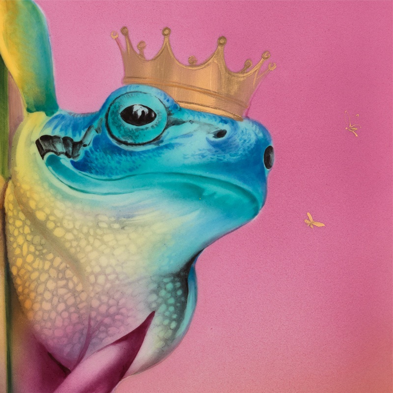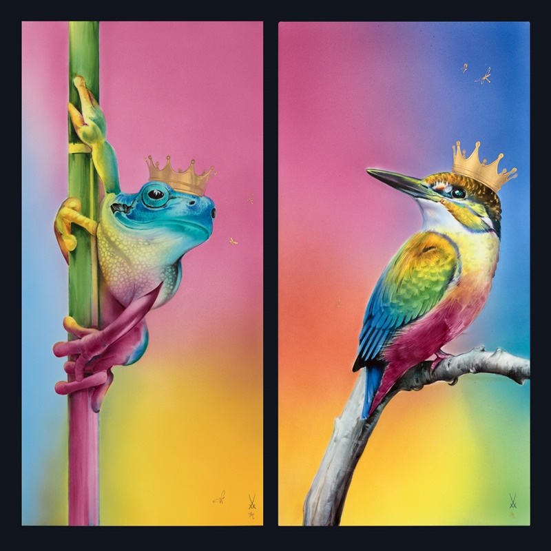 マイセンの現在、そして未来を担う若きアーティストの一人として活躍している造形家、マクシミリアン・ハークシュトッツが考案した新しい感覚のプラークをご紹介いたします。マイセン磁器製作所養成学校で学ぶマゼンタ(赤)・シアン(青)・イエロー(黄)の3原色を巧みに重ね合わせ鮮やかな色彩で仕上げました。二種類のテーマがあり、グリム童話「カエルの王様」のカエルと、英語で「Kingfisher(キングフィッシャー)」と言われるカワセミです。生き物そのものはマイセンの伝統に倣い特徴を忠実に表現しながらも現代の感性でモダンに表現されています。どちらも王冠をかぶり虹色の光の中にいるように描かれた遊び心ある作品です。