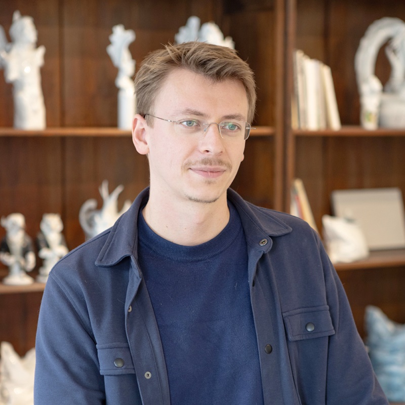 1992年生まれ。新進気鋭の造形のホープとして活躍しています。2007年、15歳で本格的に絵画を学び始め、2009年にマイセン磁器製作所付属の養成学校に入り磁器絵付と造形を学びました。卒業後、造形部門の責任者であるヨルク・ダニエルチュクの高弟として研鑽を積み、ダニエルチュク引退後は同部門を牽引するアーティストとしてユニカートの創作やさまざまな彫像のデザインに取り組んでいます。彼の動物彫像には動物の姿だけでなく、その魂までも写し取るというマイセン300年の伝統が息づいています。